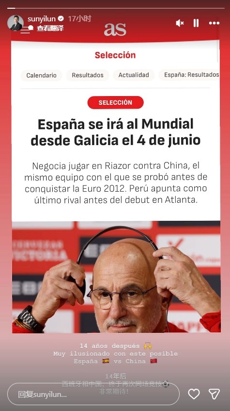 经纪人Yilun Sun在社媒转发该报道并配文写道:“14年后,西班牙和中国,终于再次同场竞技,非常期待!”